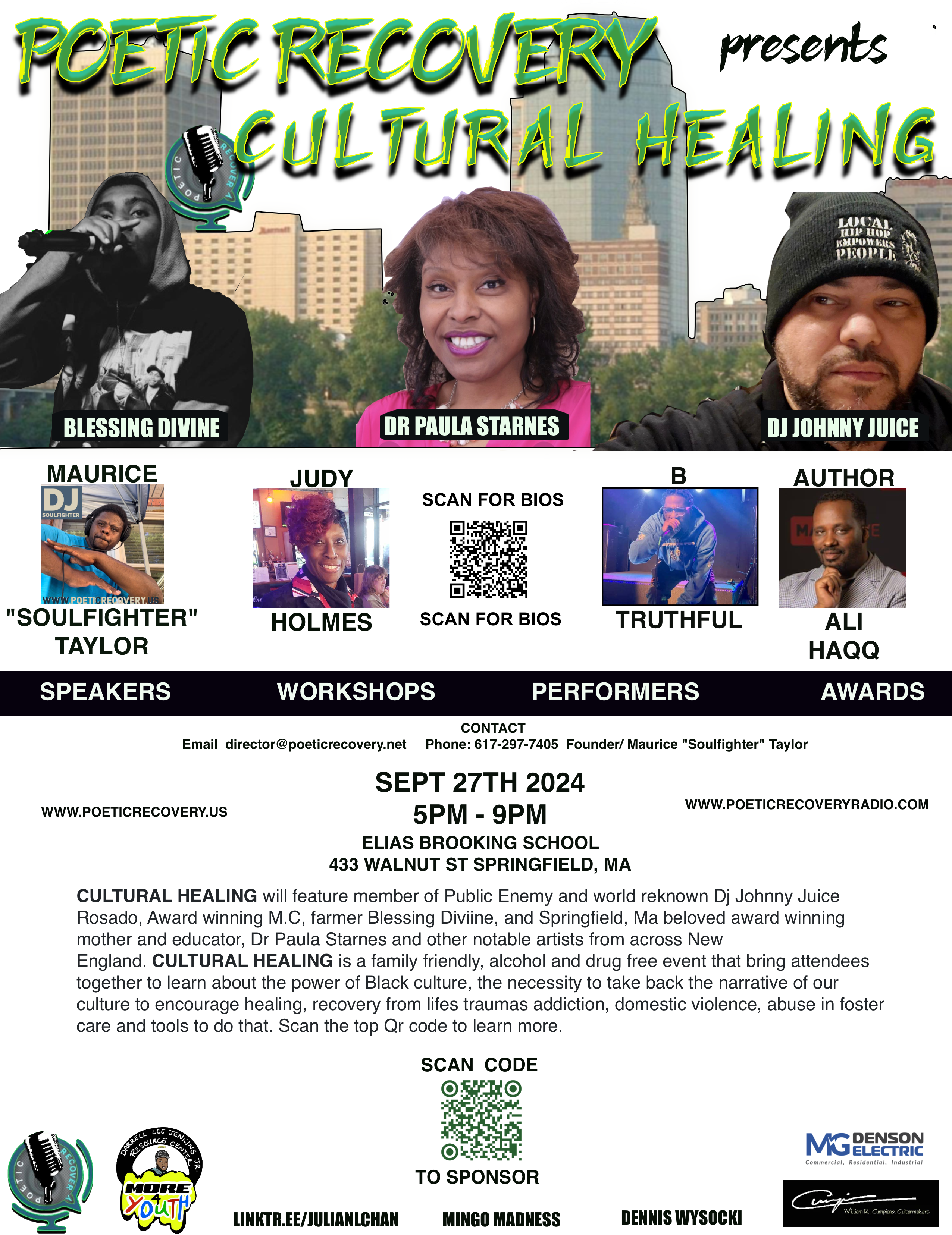 CULTURAL HEALING will take place on Friday Sept 27th 2024 from 5pm-9pm at ELIAS BROOKINGS ELEMENTARY SCHOOL 433 Walnut St, Springfield,, MA in the cafeteria. The event will feature Internationally known Dj Johnny Juice Rosado, Award winning M.C, farmer Blessing Diviine, and Springfield, Ma beloved award winning mother and educator, Dr Paula Starnes and other notable artists from across New England. Please click on participants link for bios. CULTURAL HEALING is a family friendly, alcohol and drug free event that bring attendees together to learn about the power of Black culture, the necessity to take back the narrative of our culture to encourage healing. and tools to do that CULTURAL HEALING is an empowering event for those with backgrounds of domestics and social traumatizing adversity that seek good messages to aid them in their healing. You are invited to attend one of the different workshops on "the basic of farming", "messages", and "DeeJaying" and why they are important to our health, building community, and connections. It is my hope attendees will leave with a sense of self validation and connected to a force that feeds the mind, spirit, and eventually lead to community healing and economics success.